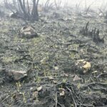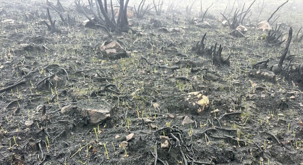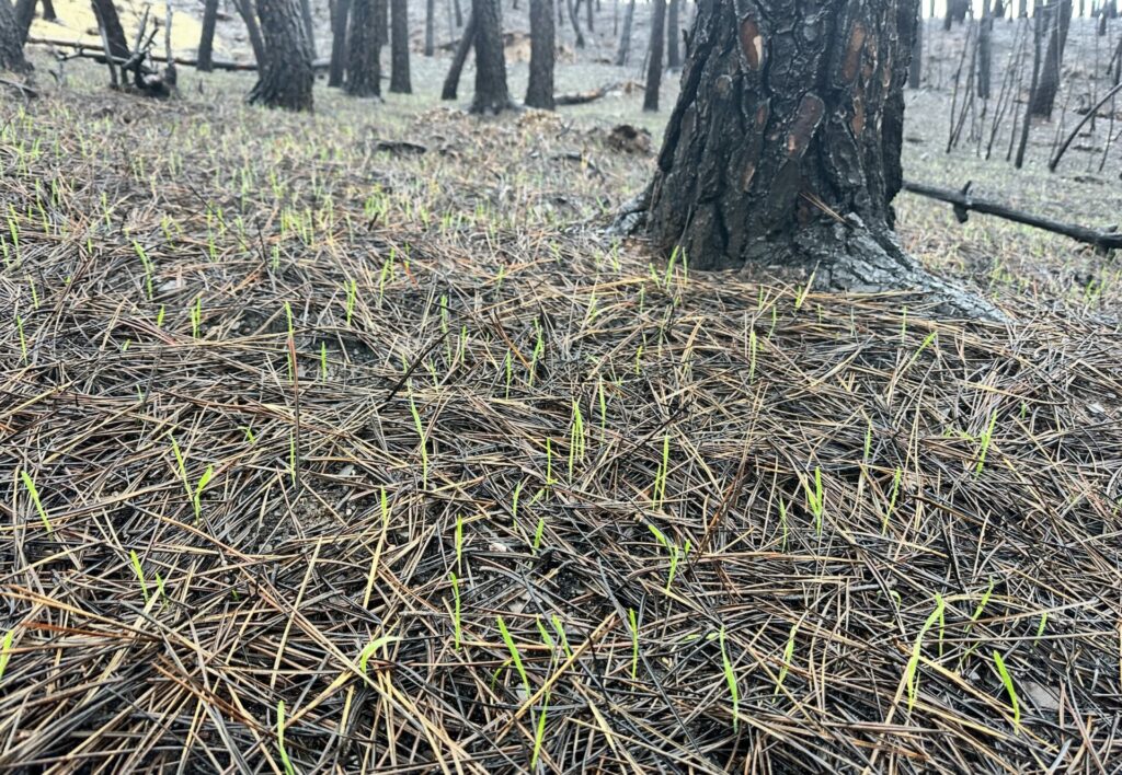 Las semillas de triticale sembradas con dron atravesaron las copas chamuscadas de los pinos y se depositaron entre la capa de acículas en el suelo, germinando y emergiendo plántulas vigorosas al cabo de un mes