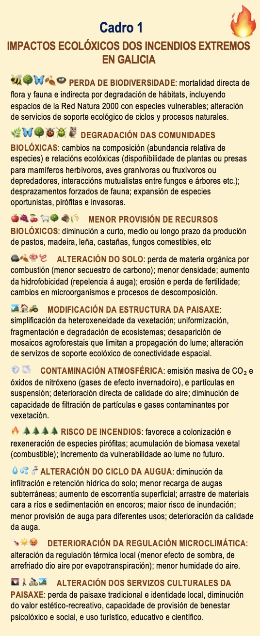 Esta concatenación de factores desencadeou unha severidade do lume catastrófica en diversos puntos, provocando impactos ecolóxicos devastadores (Cadro 1). Estes danos, concentrados xeograficamente afectaron gravemente á biodiversidade e aos servizos ecosistémicos, particularmente aqueles vinculados ao ciclo da auga, ademais de danos nalgúns núcleos habitados.