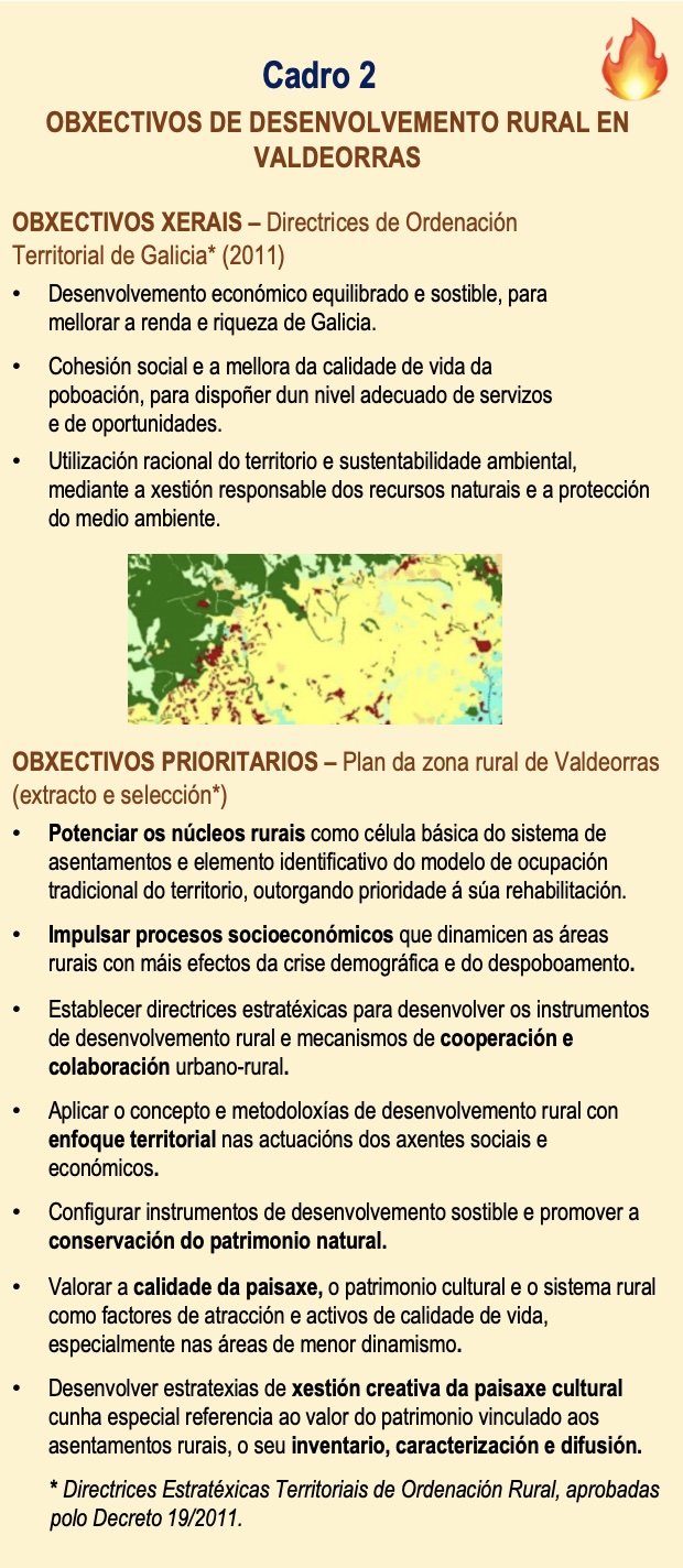 As Directrices de Ordenación Territorial (DOT) de Galicia establecen un modelo territorial e marcan os criterios para o desenvolvemento rural, a integración de usos agrarios, forestais e sociais no medio rural, que se articulan mediante plans de zona (Cadro 2). Definen a comarca de Valdeorras como un “espazo rural periférico”, con risco de despoboamento e abandono.