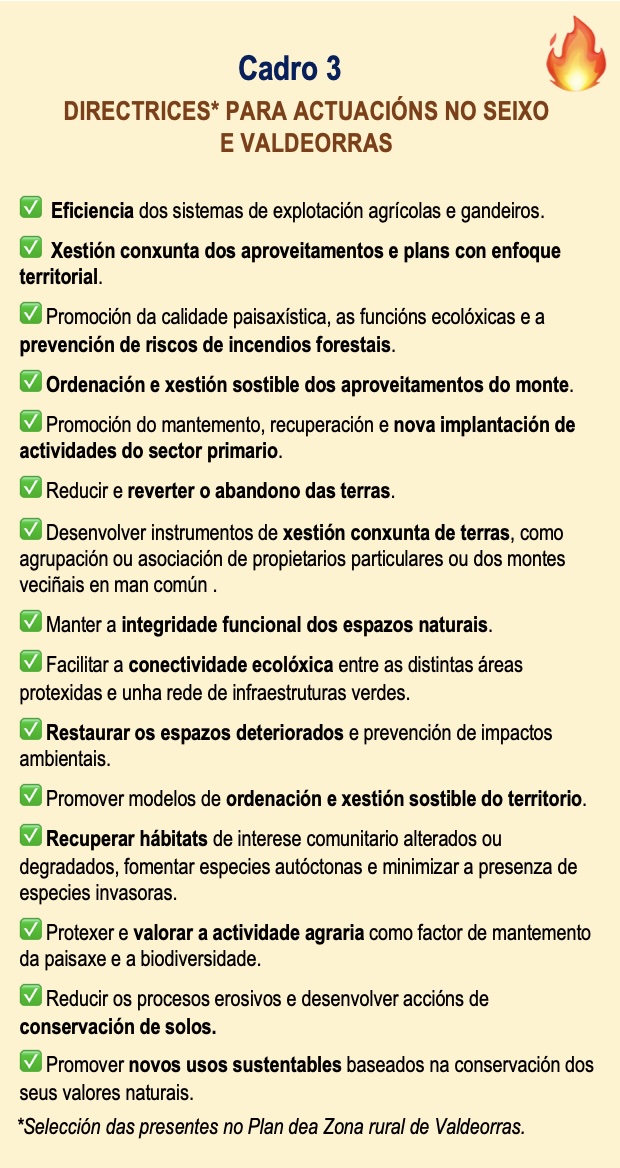 As directrices directas aplicables a actuacións a Valdeorras e no Seixo en particular descríbense no Cadro 3. Reverter o abandono, xestión colectiva de terras, restaurar e previr incendios son actuacións que deben pasar de palabras nun documento a actuacións no territorio.