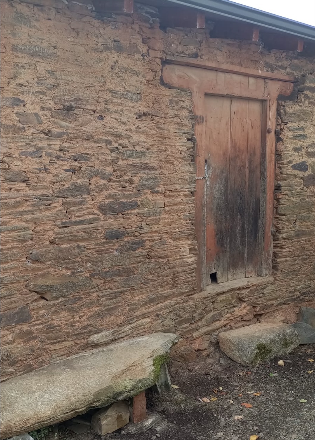Construción rural tradicional de uso agrogandeiro do Seixo, con muros de lousa e unha porta de madeira maciza con marco de madeira, probablemente de castiñeiro. Ten un banco de pedra ou poio característico das aldeas do interior de Galicia, usado para descansar ou apoiar cargas