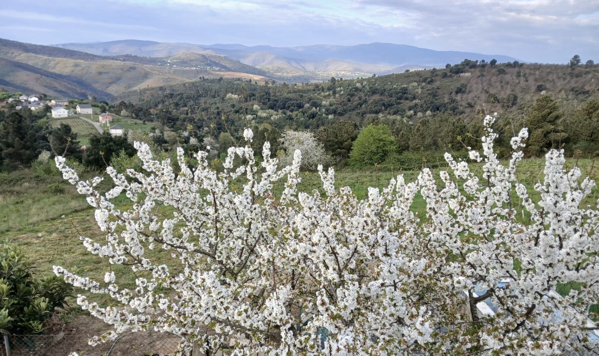Cereixo en flor en abril no Seixo. Á esquerda, O Lombeiro