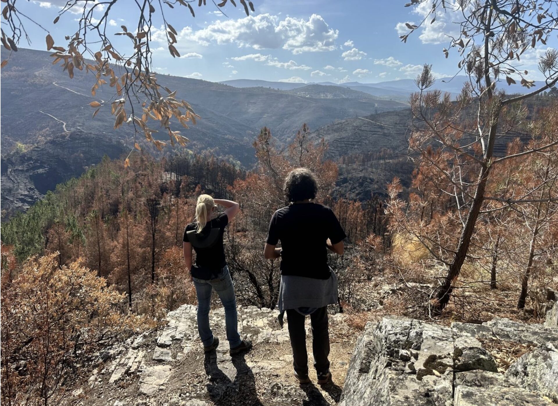 Eliska e Antón, unha parella nova no pobo, contemplando o monte veciñal queimado do Seixo o 17 de outubro de 2025