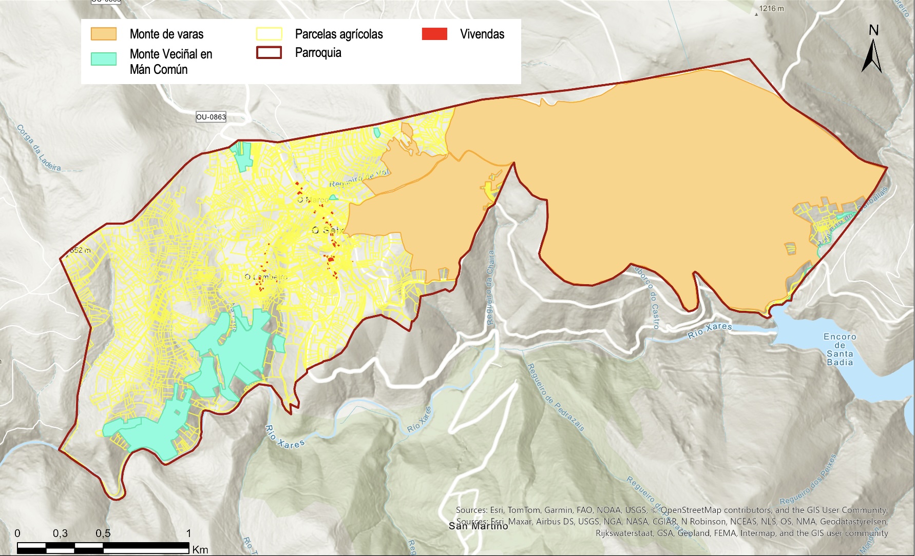 A superficie total do Seixo é ao redor de 550 ha, e podemos distinguir tres clases de propiedade privada (Figura 1). A superficie orixinalmente agrícola representa case o 50% da superficie total e está constituída por numerosas parcelas pequenas. A superficie restante é monte de propiedade colectiva veciñal. Unha pequena parte é monte en man común (menos do 5%), de todos os veciños residentes, que está sobre todo concentrado ao sur. A maioría é monte de varas (case a metade da superficie total) que, a diferenza do anterior, transmítese hereditariamente.
