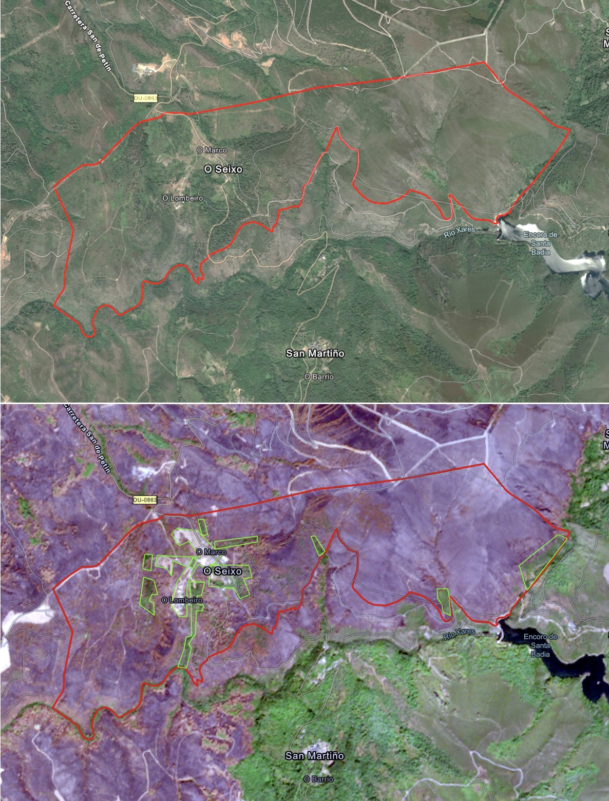 Figura 3. Delimitación da parroquia do Seixo (O Bolo, Ourense) sobre unha imaxe de Google Earth antes do incendio (superior; 27/6/25) e despois (inferior; 5/9/25). En está última identifícanse as áreas non afectadas polo lume mediante polígonos cunha liña verde. Fonte: Google Earth