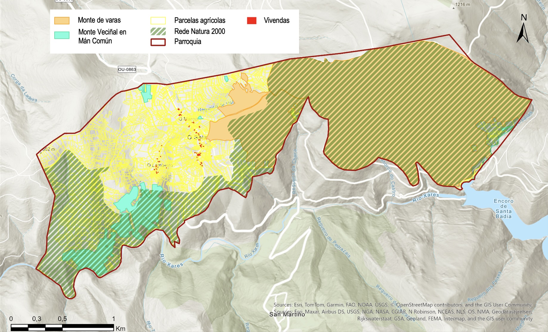O monte de varas e veciñal (en diante denominámolo comunal) e áreas agrícolas do suroeste da parroquia forman parte do extremo nororiental do espazo protexido Macizo Central, que forma parte da Rede Natura 2000, que representa case o 70% da superficie total da parroquia (Figura 2).