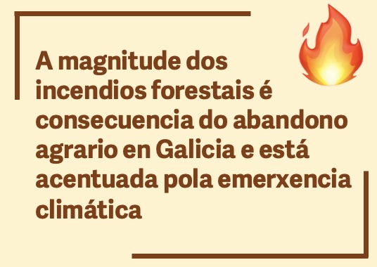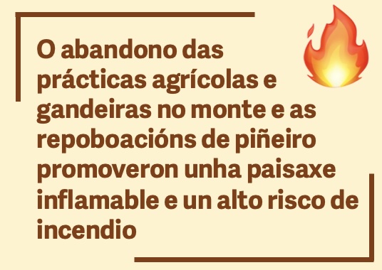 O abandono agrario subxace a unha estrutura da paisaxe e ao predominio dunha vexetación moi vulnerables ao lume, máis aló da mera acumulación de biomasa e conectividade do combustible. En moitas áreas foi un incendio de copa que saltou cortalumes, pistas e estradas, liberando pavesas que, arrastradas por un vento cambiante, propagaron o lume de maneira incontrolable.
