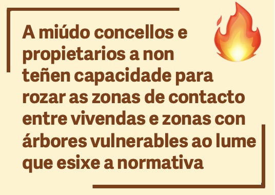 Hoxe piñeiros e vexetación natural proliferan na contorna das vivendas en moitas áreas, habendo casos nos que están pegados ás propias vivendas ou mesmo as estradas que comunican pequenas localidades. Os concellos ou os veciños non poden conservar rozadas unhas mínimas franxas ou áreas protectoras do lume. “Teño 80 anos e unha pensión de 700 euros, non podo manter limpas as miñas leiras”, di un veciño dunha aldea de Vilamartín de Valdeorras, segundo relata o seu alcalde Enrique Álvarez, que recoñece as severas limitacións que teñen os concellos pequenos para protexer do lume segundo a normativa.