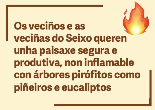 Ningunha persoa do Seixo quere piñeiros na súa contorna. Existe un consenso, é unha especie para erradicar do territorio da parroquia. Tampouco desexan que exista eucalipto, outra especie pirófita. Existe un pequeno rodal de eucalipto na contorna do pobo. Acertan, pois a capacidade de ignición, de propagación do lume, e mesmo a velocidade de propagación do lume en ladeiras con vento, supera á do piñeiro.