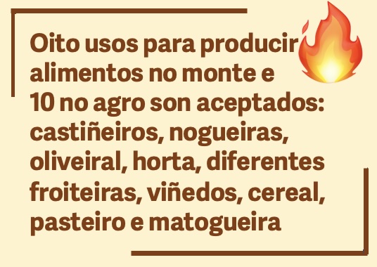A comunidade considera apropiados 10 tipos de usos diferentes para a produción de alimentos no espazo agrícola, mediante sistemas agrícolas ou agrogandeiros: viñedo, horta, froiteiras de pebida, froiteiras de óso, figueiras, nogueiras, soutos, oliveiral, cultivo de cereal e pasteiro. As preferencias dos propietarios son moi variables, entre un e 10 usos, sendo a media entre cinco e seis tipos de usos diferentes. Entre o 50% e 60% das persoas propietarias opta por recuperar ou potenciar onde sexa posible unha paisaxe con horta, árbores froiteiras (como maceiras, pereiras, cereixos e ameixeiras), viñedos, oliveiral e soutos.
