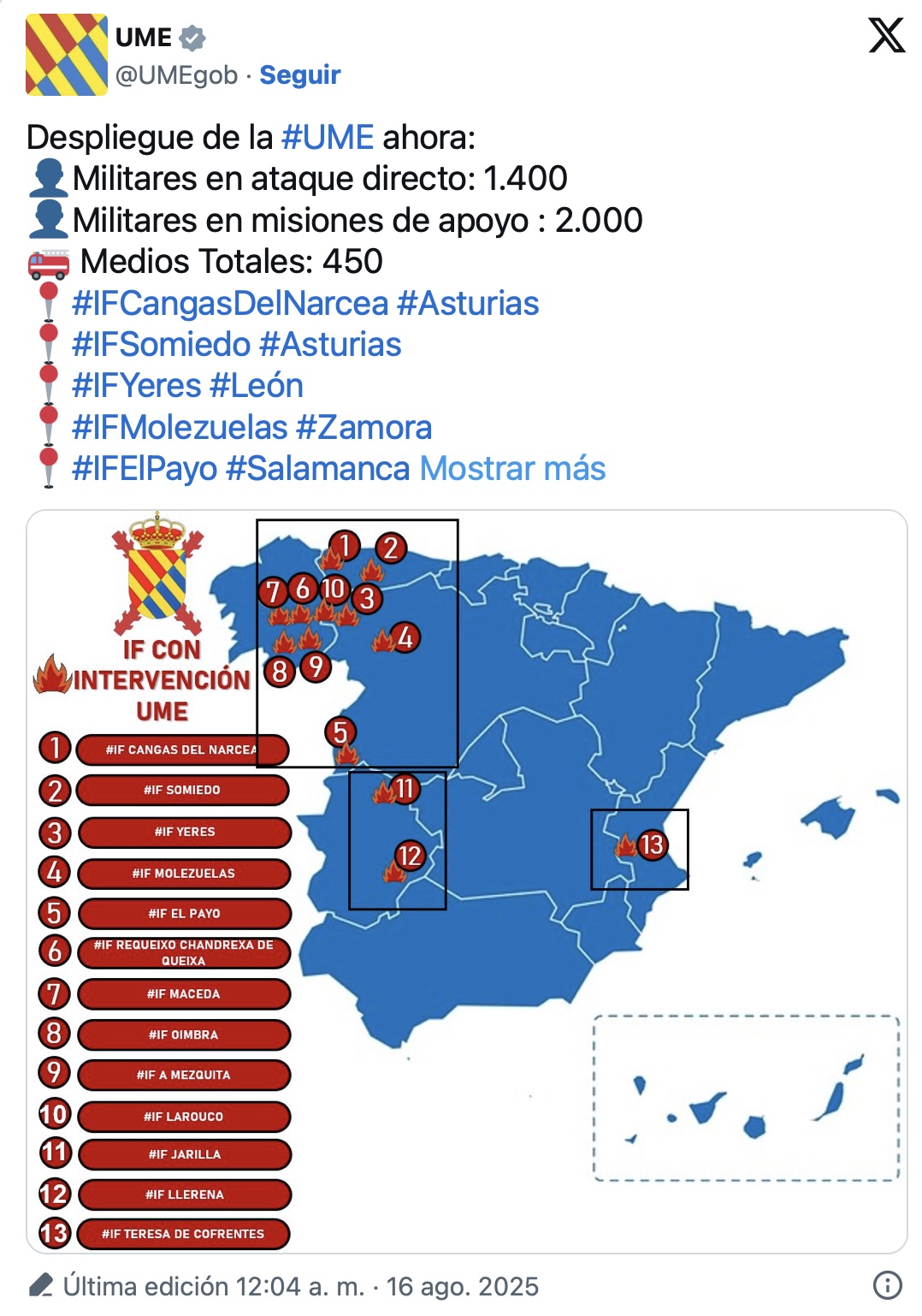 Pola súa magnitude activouse o nivel 2 de emerxencia na provincia de Ourense, e mobilizouse á Unidade Militar de Emerxencias (UME) entre outros recursos extraordinarios para a súa extinción, estando todos absolutamente desbordados pola gran cantidade de focos presentes, o que dificultou a chegada de medios a moitos lugares. Por iso o veciños tiveron que loitar por salvar os seus pobos.