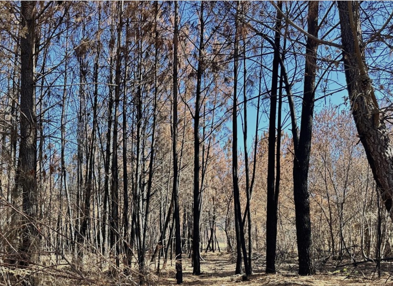 Conxunto de sobreiras chamuscadas nunha leira de antigo uso agrícola afectada polo incendio de O Seixo